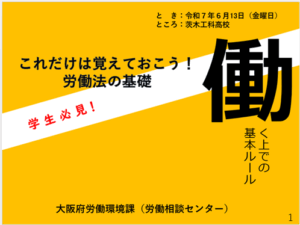 大阪府労働環境課(労働相談センター)より講師を派遣してもらい 労働法の基礎知識について説明をしていただきました。